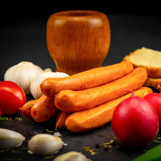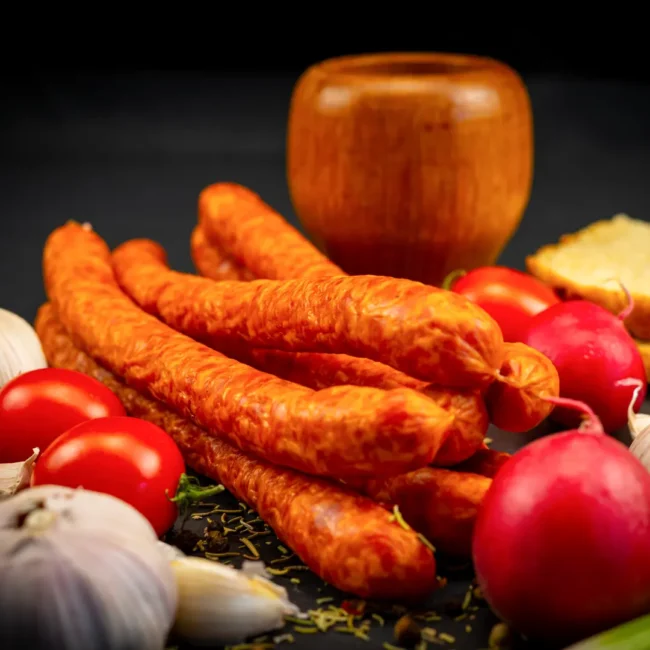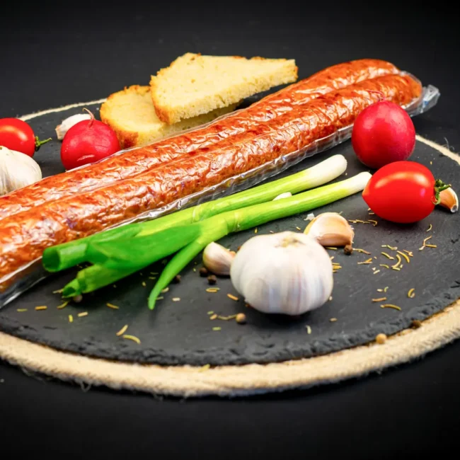 Carne porc 59%, carne vită 17%, slănină, sare, apă, condimente naturale. Produs afumat. Membrană naturală.