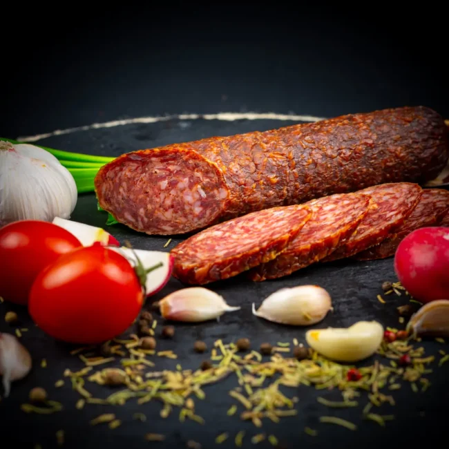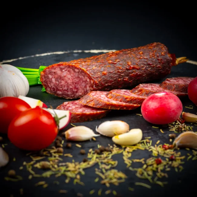 Carne cerb 51%, carne porc 39%, carne vită 5%, slănină 5%, sare, condimente naturale. Produs crud afumat. Membrană artificială necomestibilă.